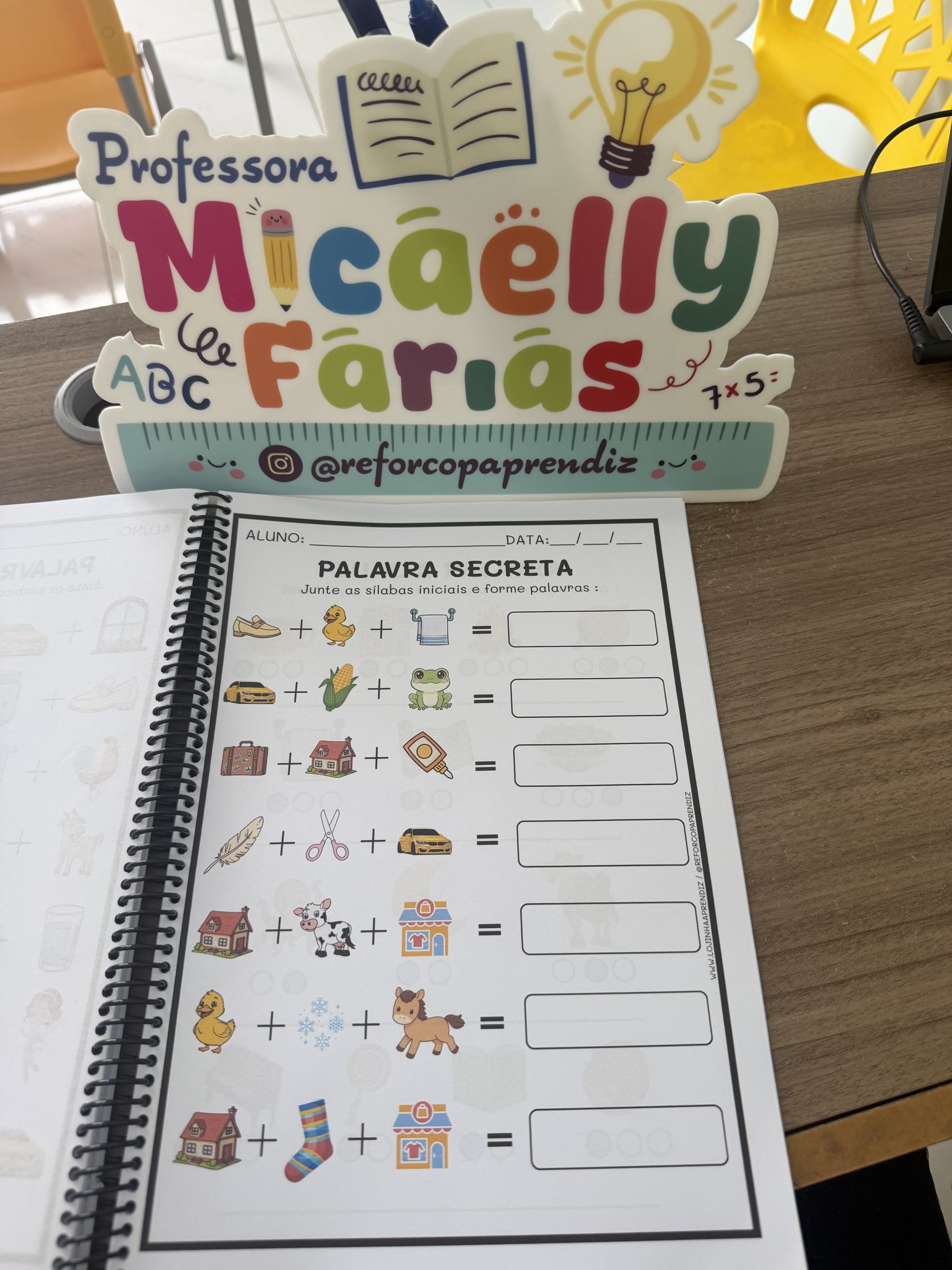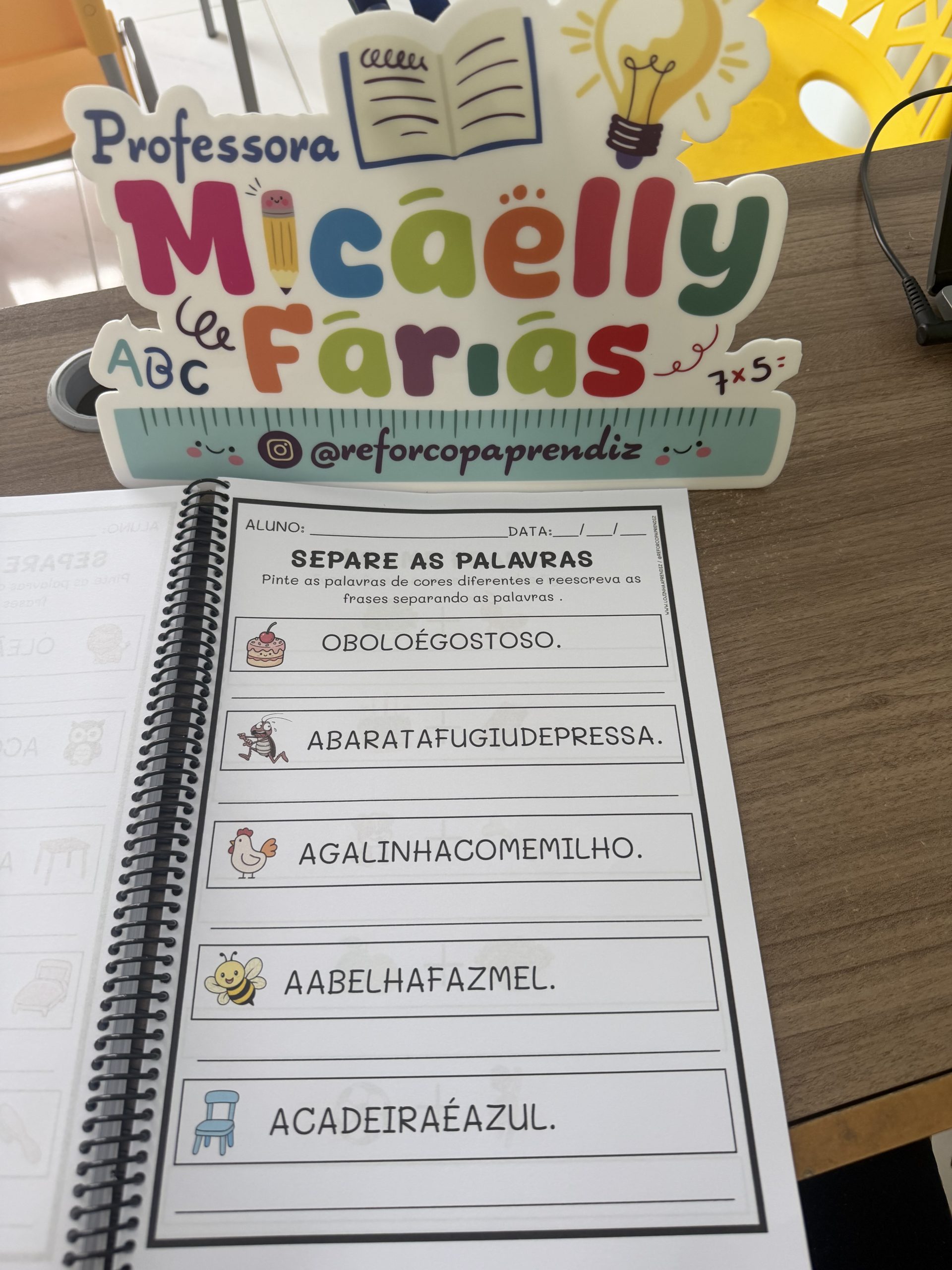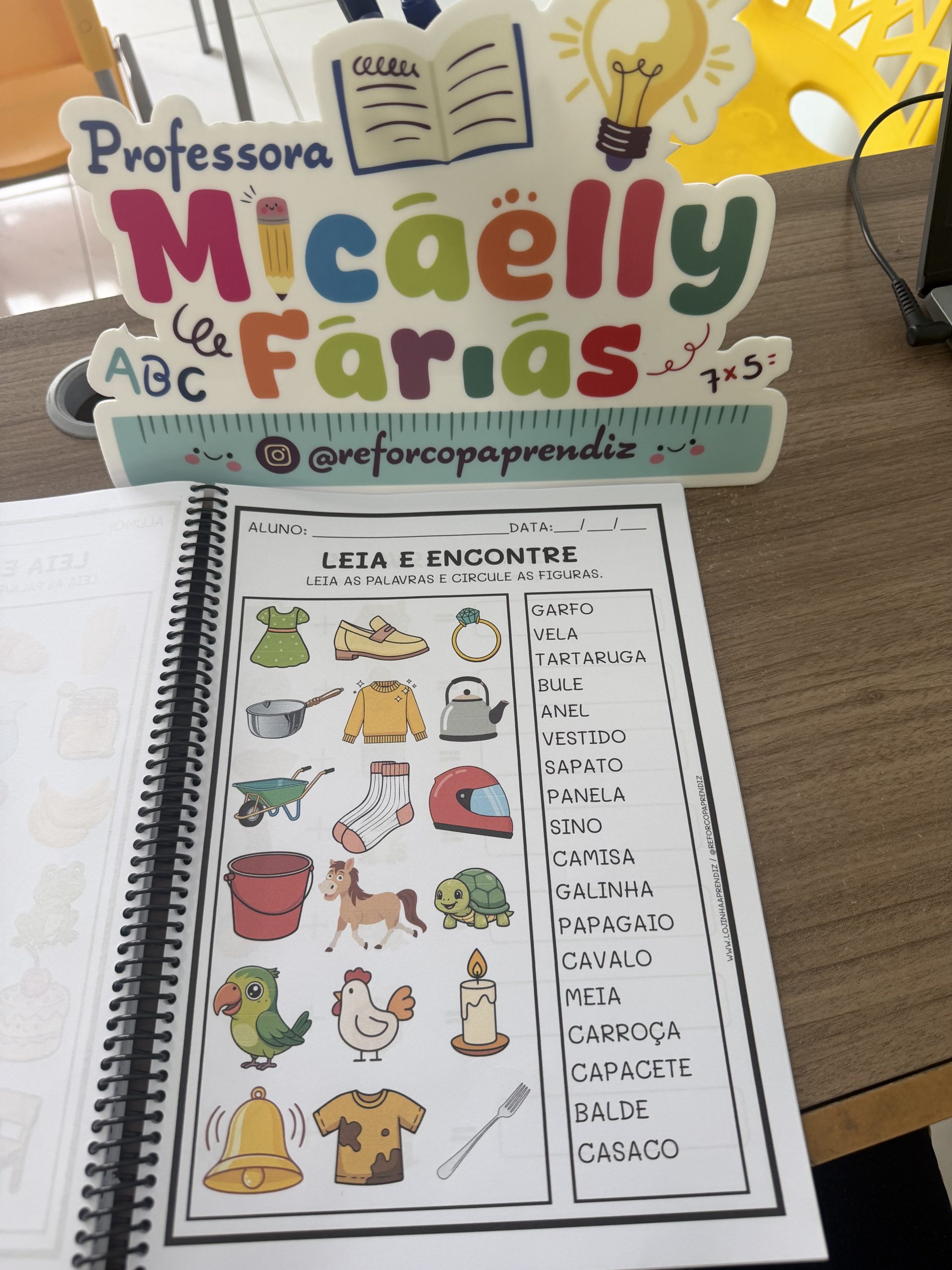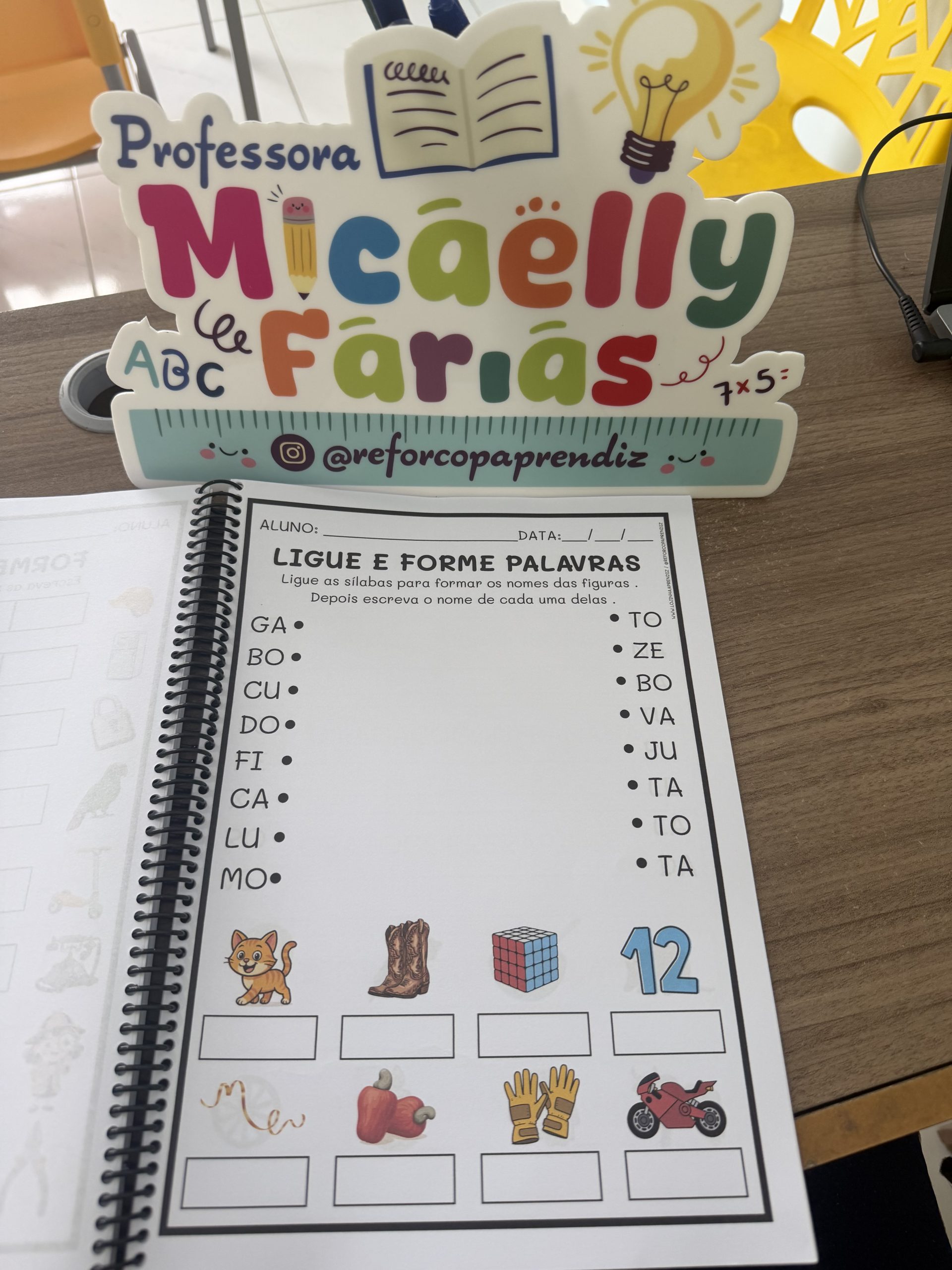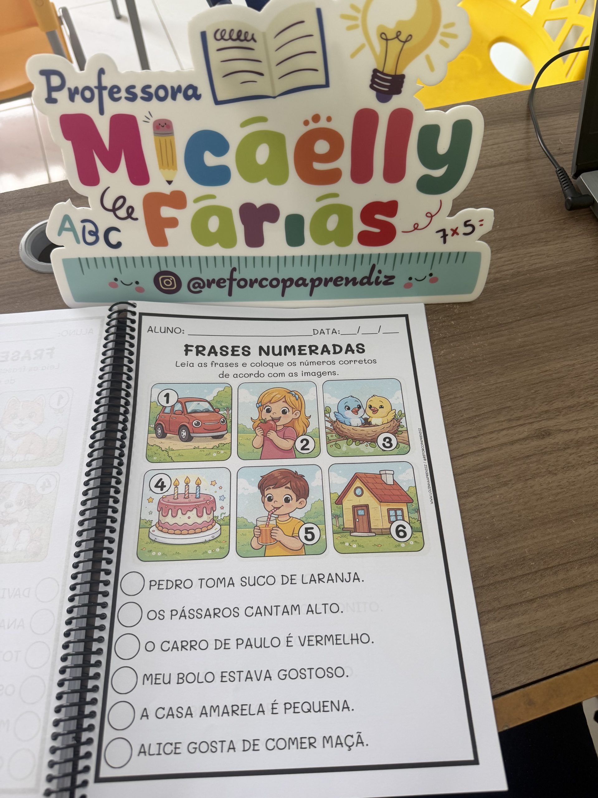 Caderno de atividades para alfabetização com 50 páginas envolvendo atividades de leitura e escrita de palavras e frases de forma lúdica e colorida.