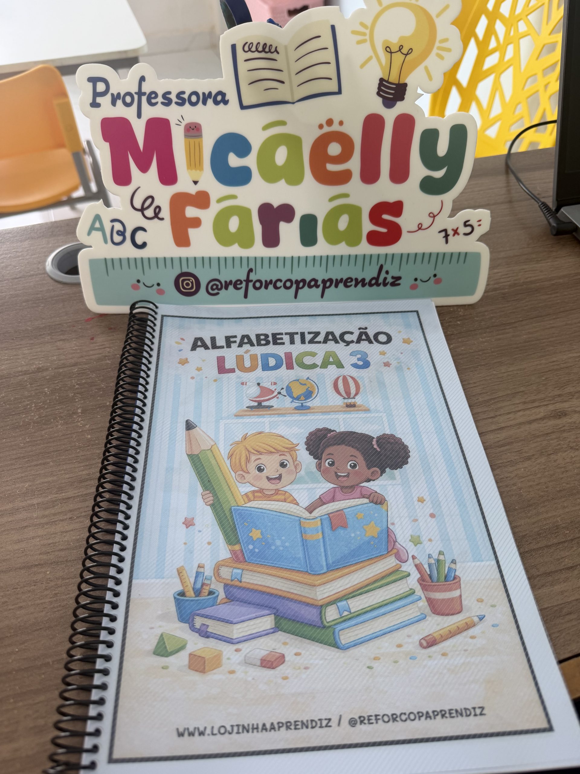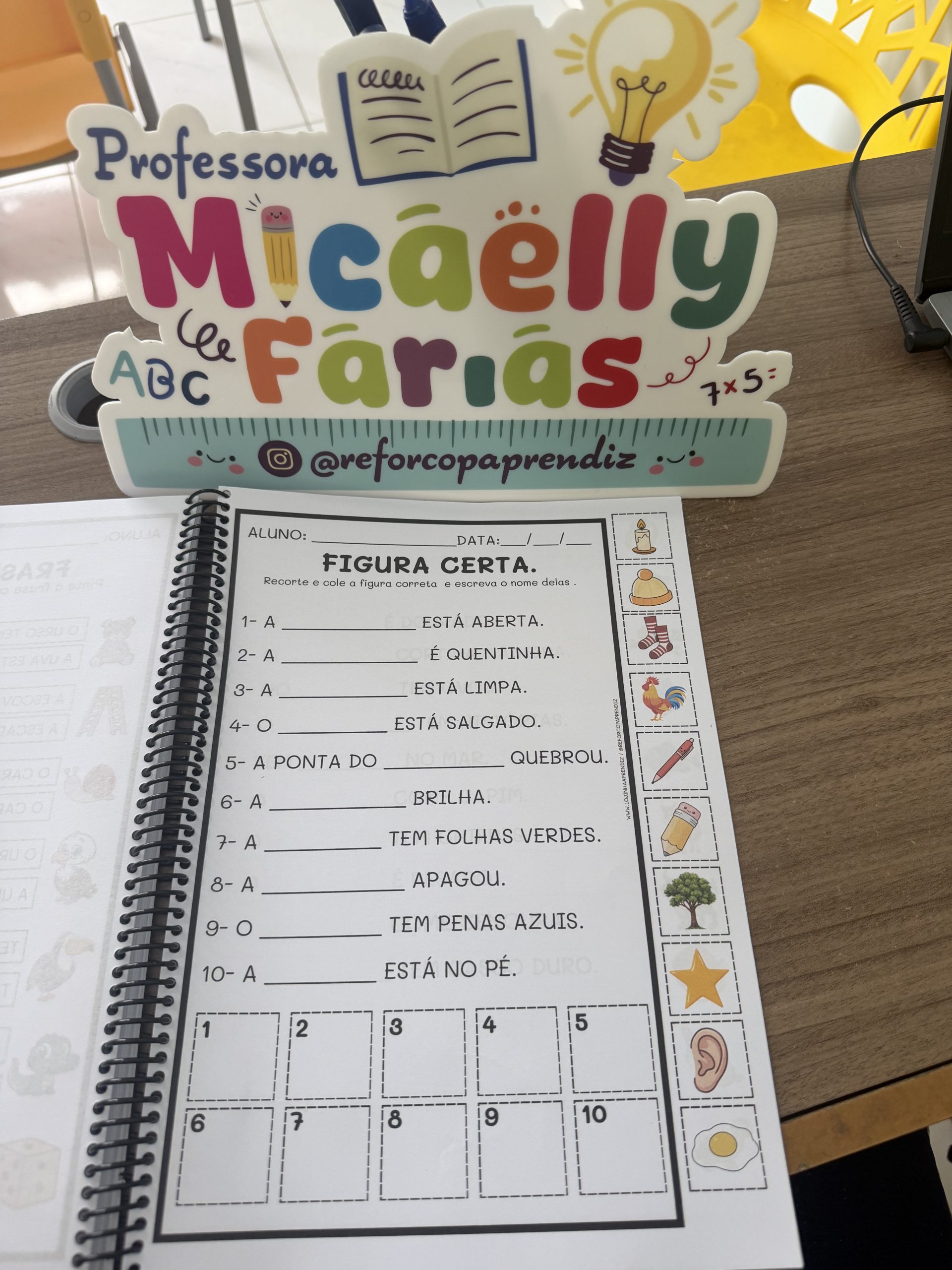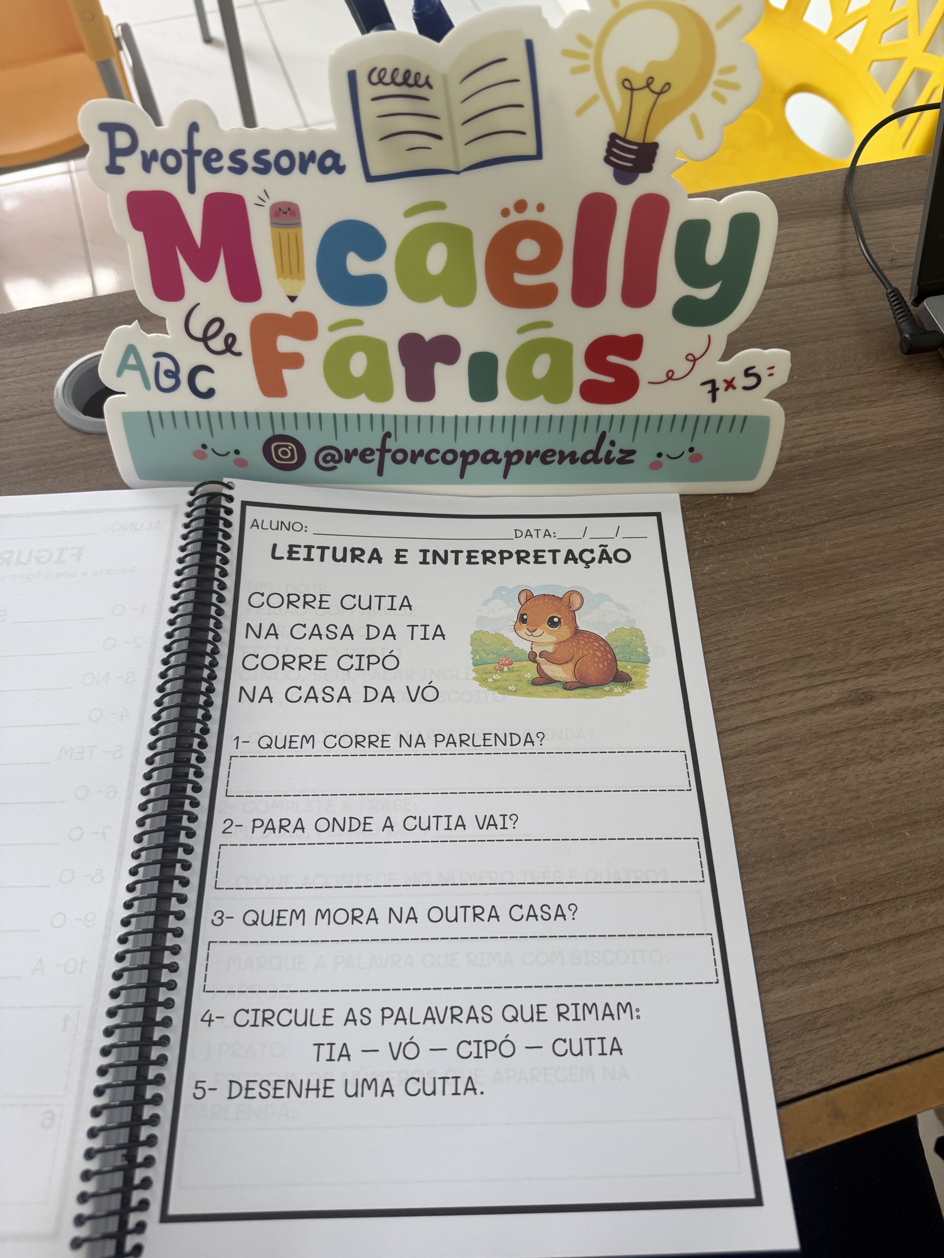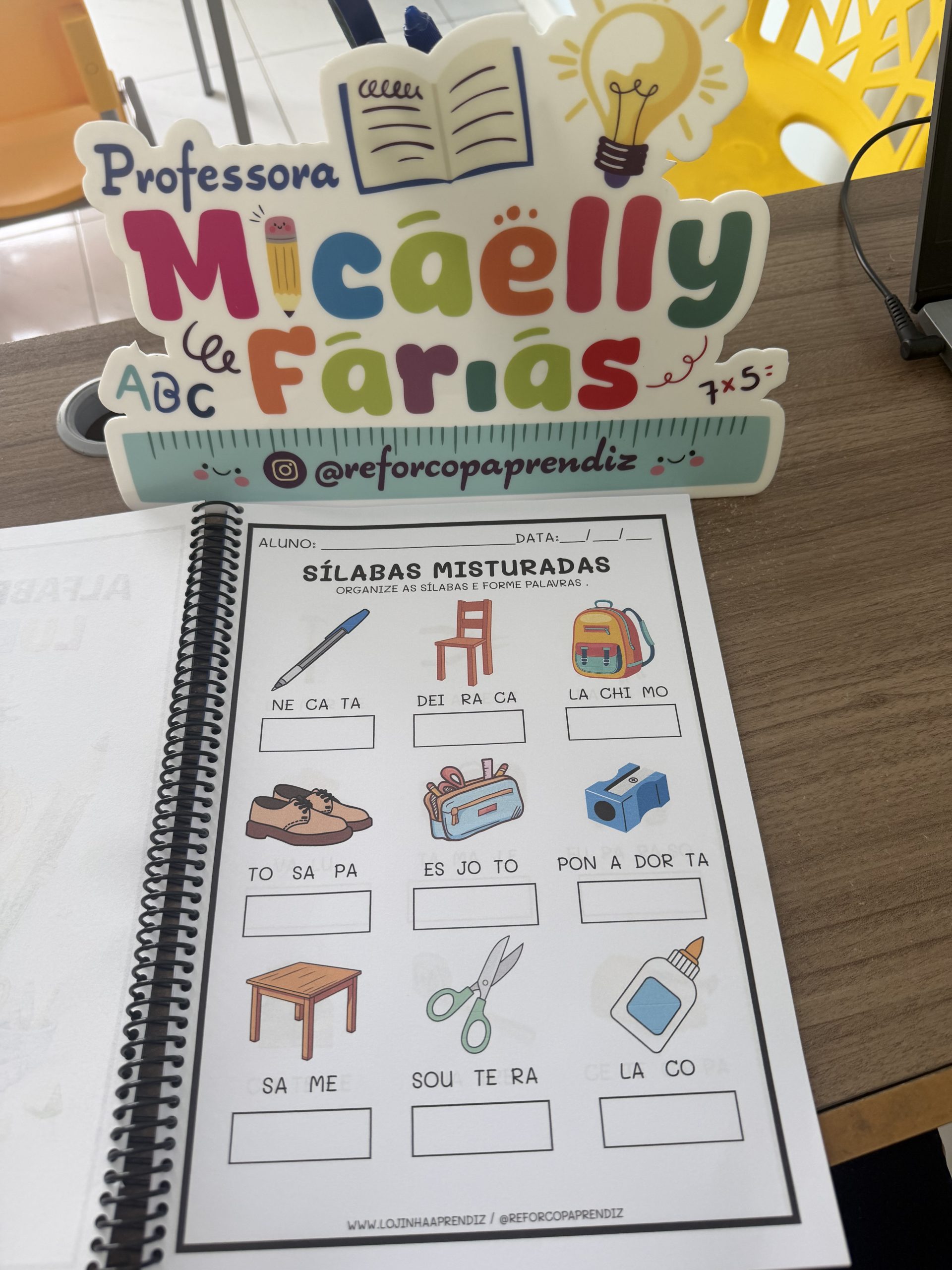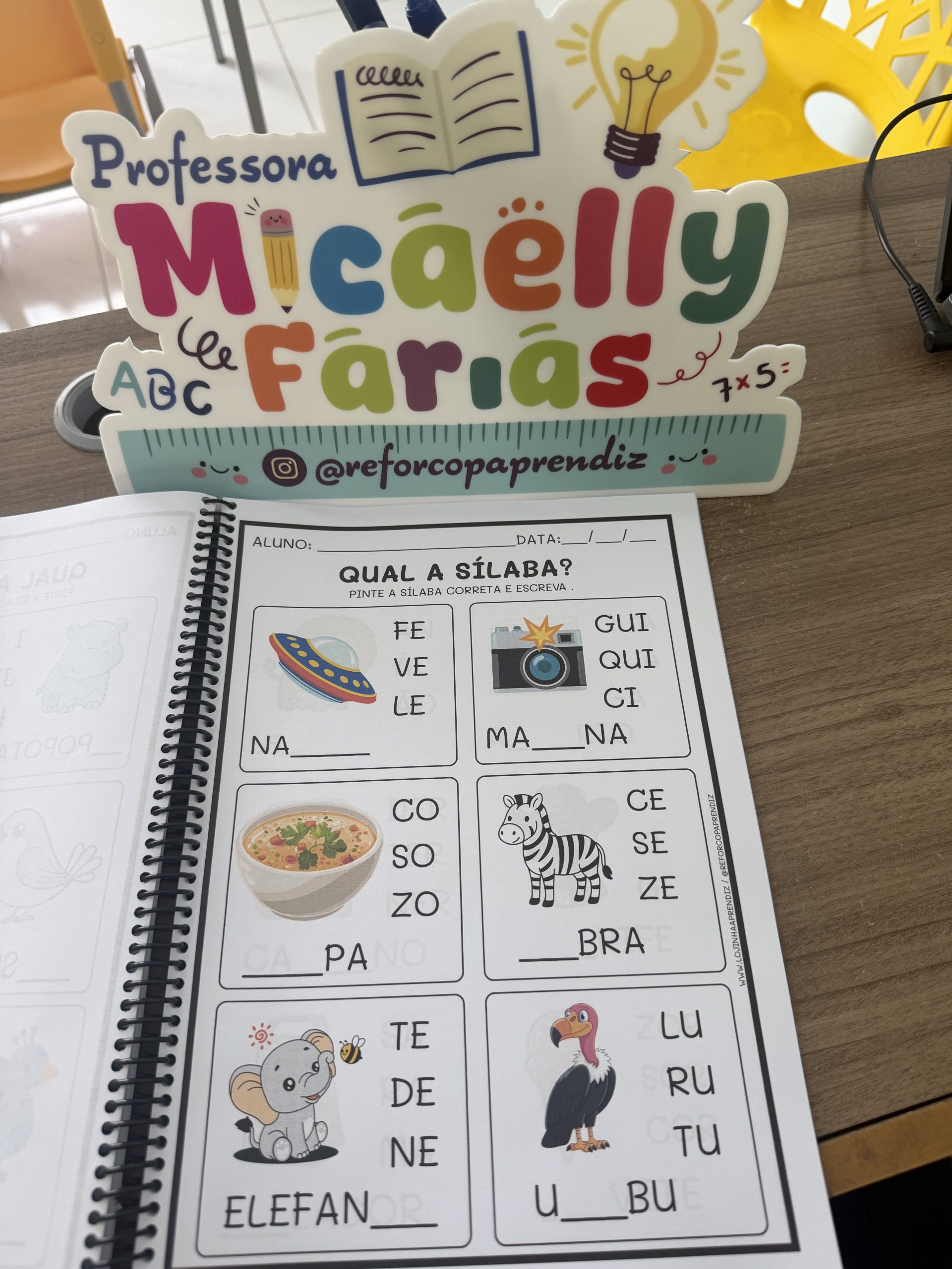 Caderno de atividades para alfabetização com 50 páginas envolvendo atividades de leitura e escrita de palavras e frases de forma lúdica e colorida.